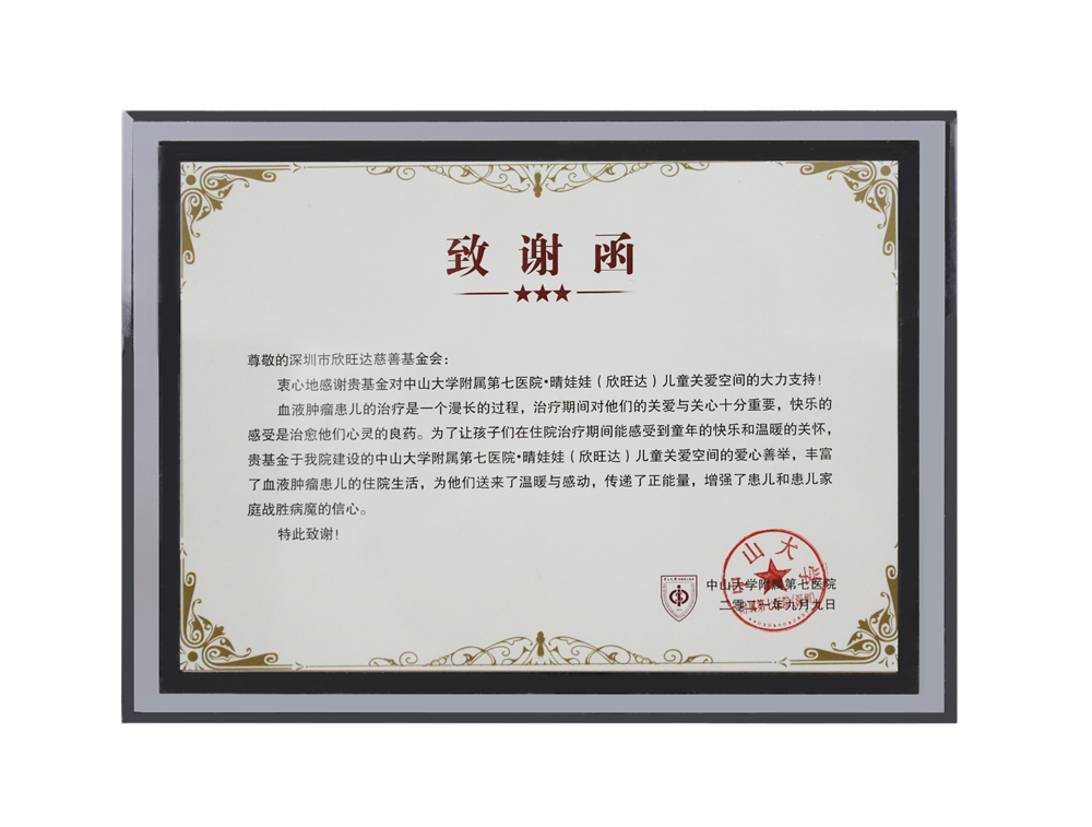中山大学附属第七医院晴娃娃致谢函